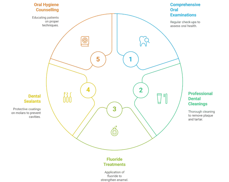 - Oral Hygiene Education: Guidance on effective brushing, flossing, and dietary habits.